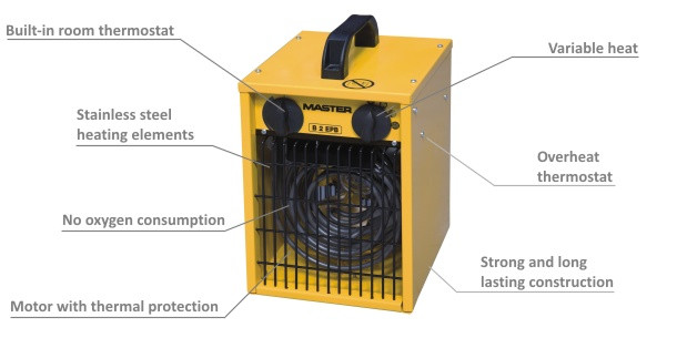 Robustní elektrické topidlo DESA Master B 2 EPB v plechové skříni vhodné na stavby a do průmyslových prostor. Topidlo může pracovat v uzavřených prostorách.
