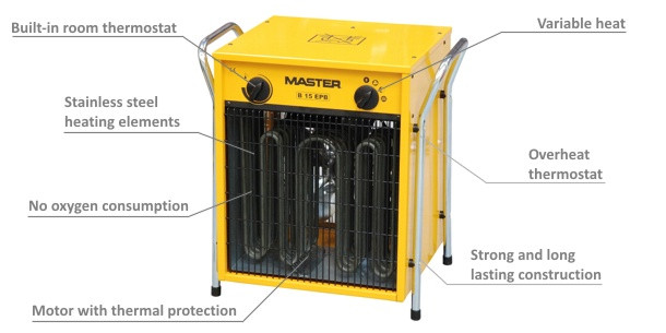 Robustní elektrické topidlo Desa Master B 15 EPB v plechové skříni vhodné na stavby a do průmyslocých prostor. Topidlo může pracovat v uzavřených prostorách.