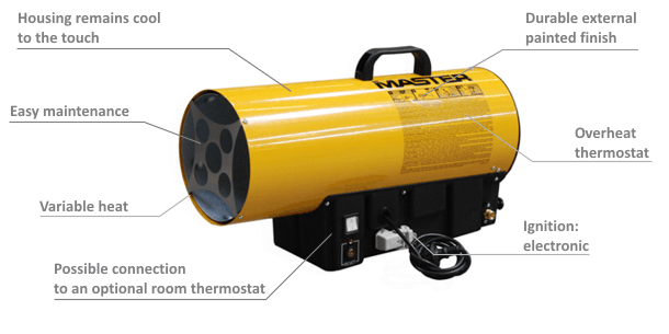 Přenosné plynové topidlo Master BLP 33 ET slouží k vytápění staveb a průmyslových prostor.