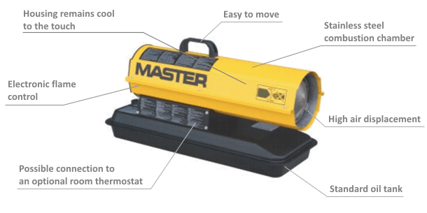 Přenosné topidlo Desa Master B 35 CED na naftu, nebo extralehký topný olej pro vytápění staveb a jiných dobře větraných prostor.