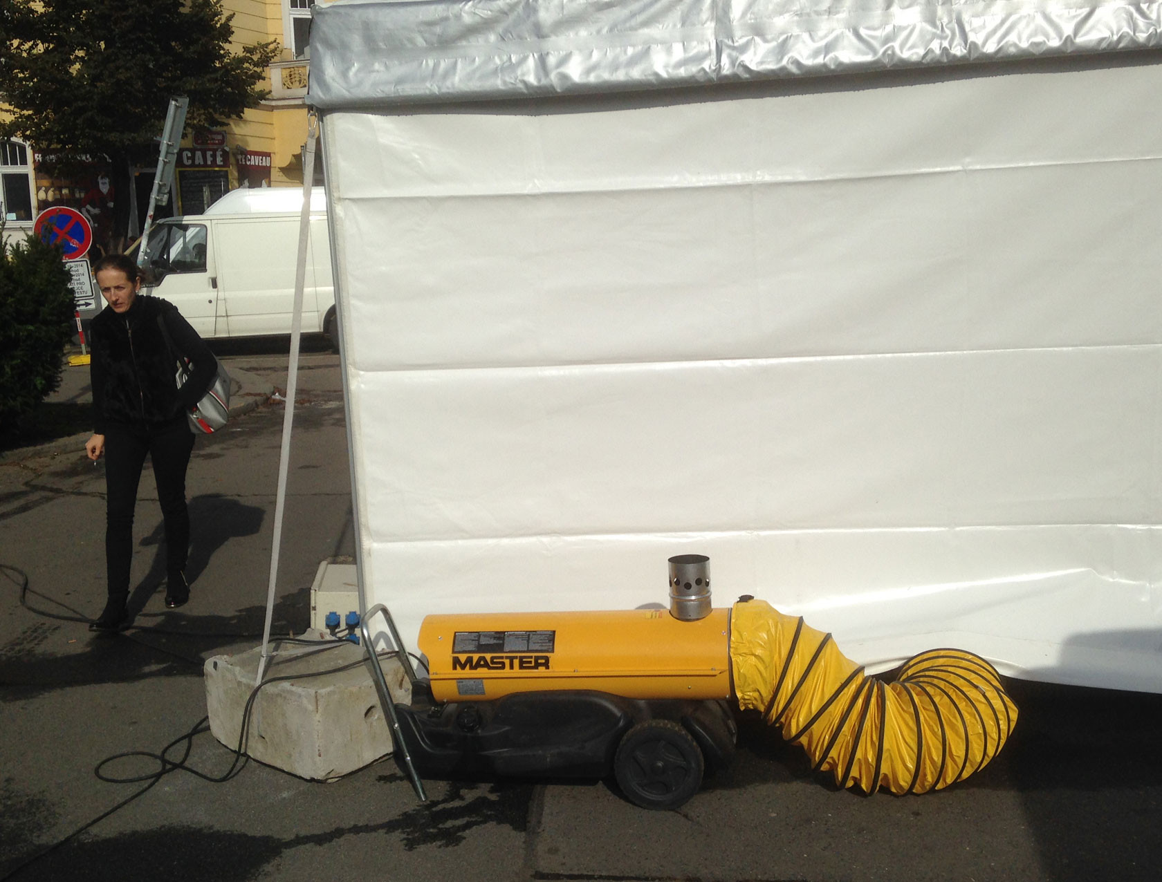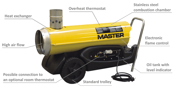 Přenosné topidlo Master na naftu, nebo lehký topný olej.Topidlo je vybaveno tepelným výměníkem, spaliny se odvádějí ven kovovou hadicí nasunutou na komínek,