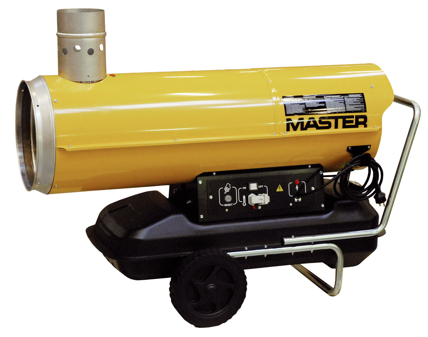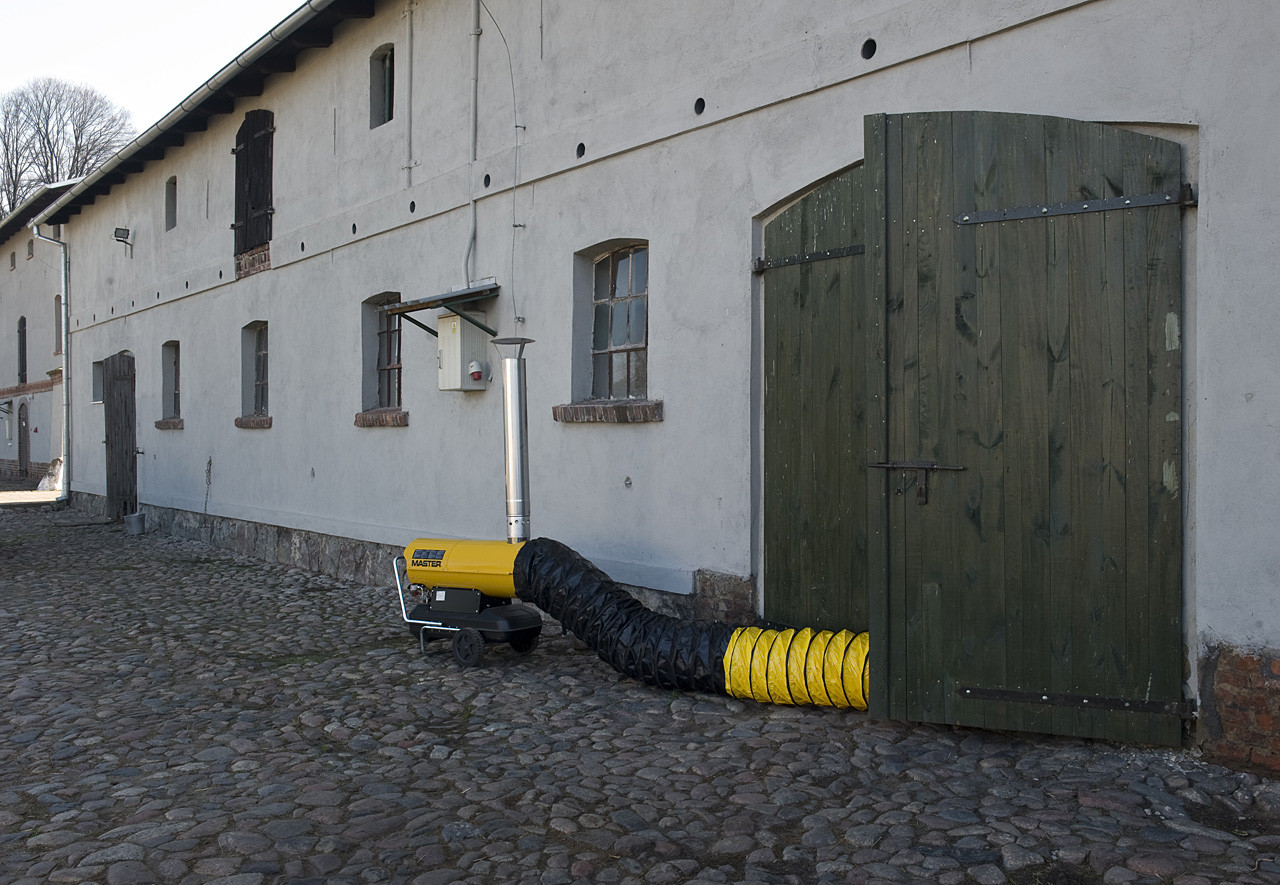 Přenosné topidlo Master na naftu, nebo lehký topný olej.Topidlo je vybaveno tepelným výměníkem, spaliny se odvádějí ven kovovou hadicí nasunutou na komínek,