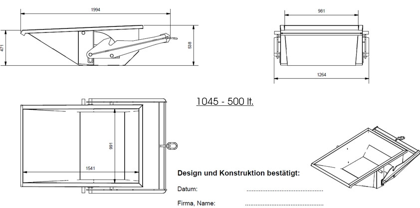 V obrazové galerii je rozměrový náčrt, v rubrice "Ke stažení" je krátké video o použití výklopného kontejneru na stavbě.