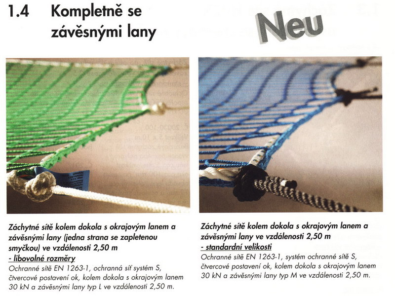Na síti jsou upevněny zkušební vzorky pro kontrolu pevnosti šňůry ve zkušebně. ( jsou tam 3 vzorky, celková životnost sítě je 4 roky) Sítě se dodávají ve standartních rozměrech (viz. níže), nebo v rozměrech na zakázku. Upevňují se ke konstrukci pomocí pletených lan o únosnosti 30 kN.