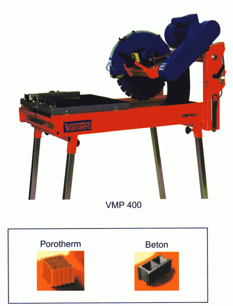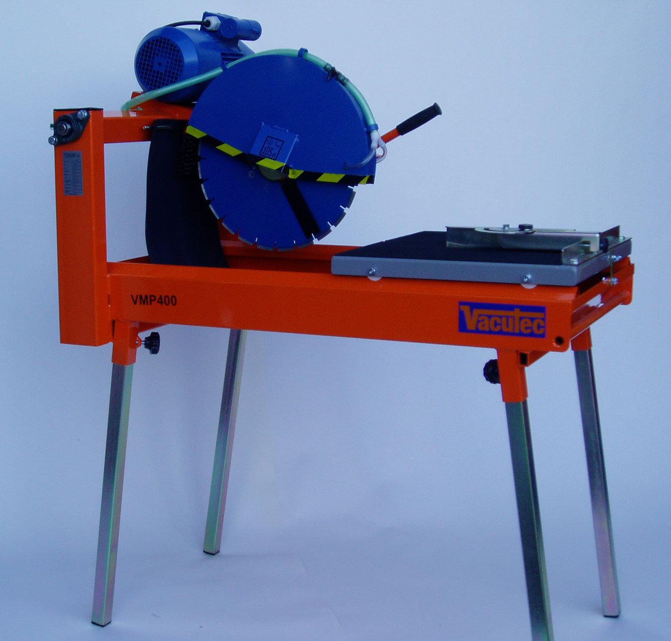 Profesionální diamantová Vacutec pila s pojízdným stolem. Vhodná pro řezání cihel, bloků, tvarovek, zámkové dlažby a podobně. Pila je vybavena vodním chlazením. Cena pily i s profesionálním kotoučem o průměru 400 mm, otvor 25,4 mm.