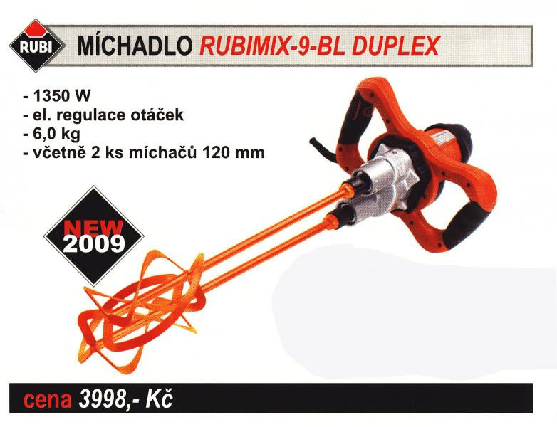 Míchadlo Rubimix Duplex od firmy Rubi díky dvojitému míchacímu ústrojí podstatně lépe promíchává stavební směsi. Je vybaveno dvěmi metlami o průměru 120 mm, které jsou součástí dodávky.