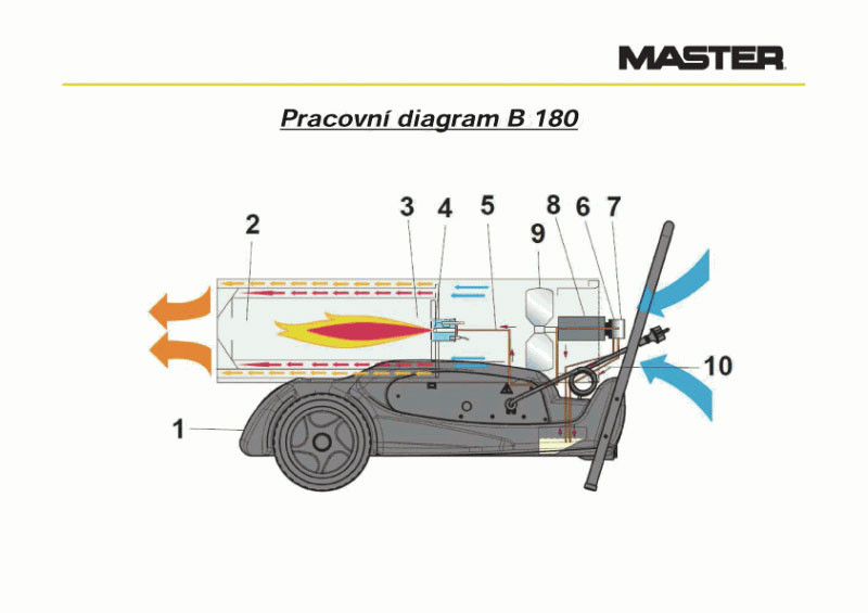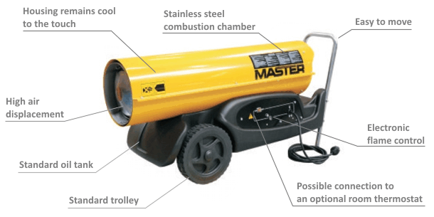 Pojízdné topidlo Desa Master B 180 na naftu, nebo lehký topný olej pro vytápění staveb a jiných dobře větraných prostor.