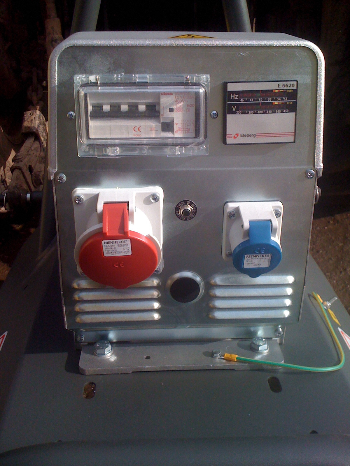- zásuvka 230 V/16 A, zásuvka 400 V/32 A, proudový chránič 30 mA, jistič, voltmetr, ukazatel frekvence