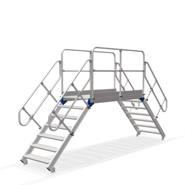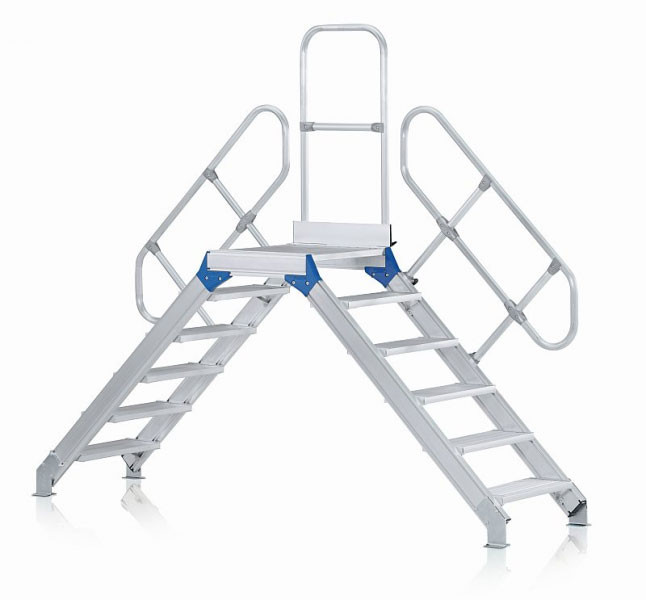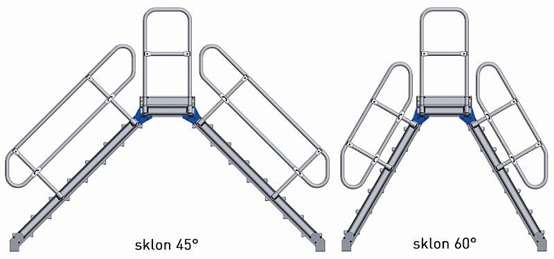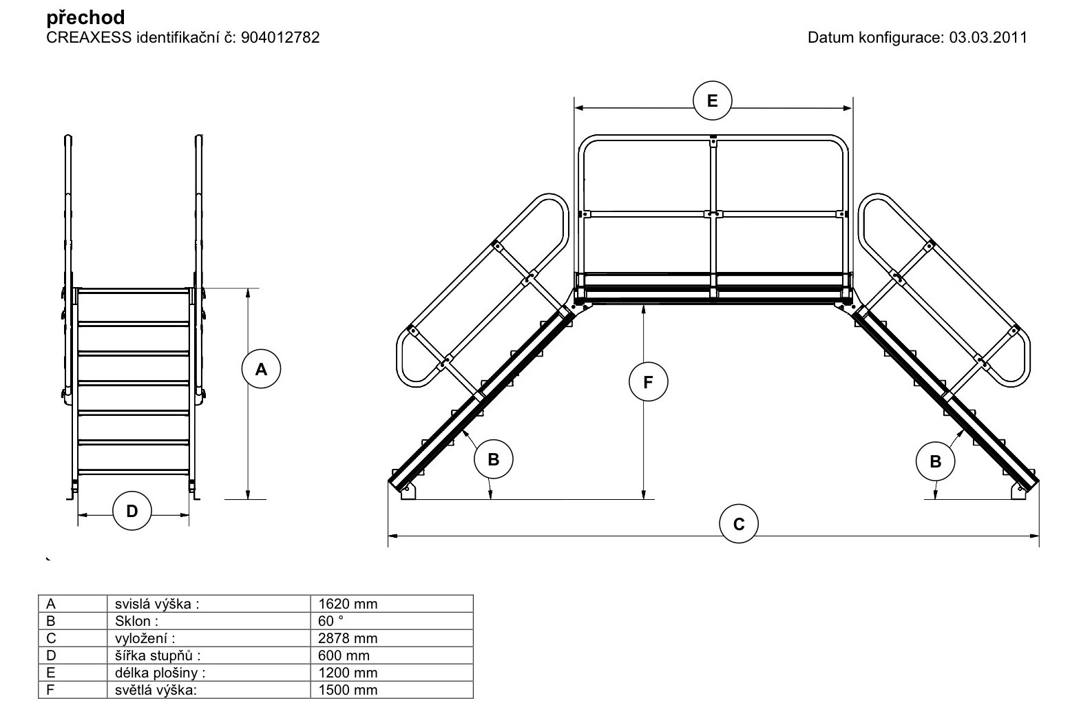 1) Přechod pevný se sklonem schodiště 45° o šíři 600 mm a s podestou nahoře o délce 600 mm, zábradlí na jedné straně: