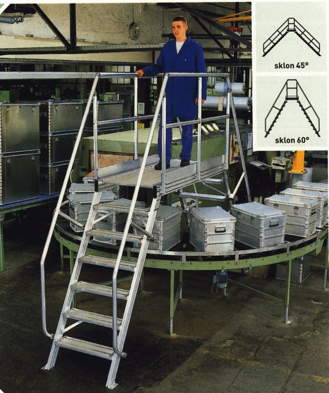3) Přechod pevný se sklonem schodiště 60° o šíři 800 mm a s podestou nahoře o délce 600 mm, zábradlí na jedné straně: