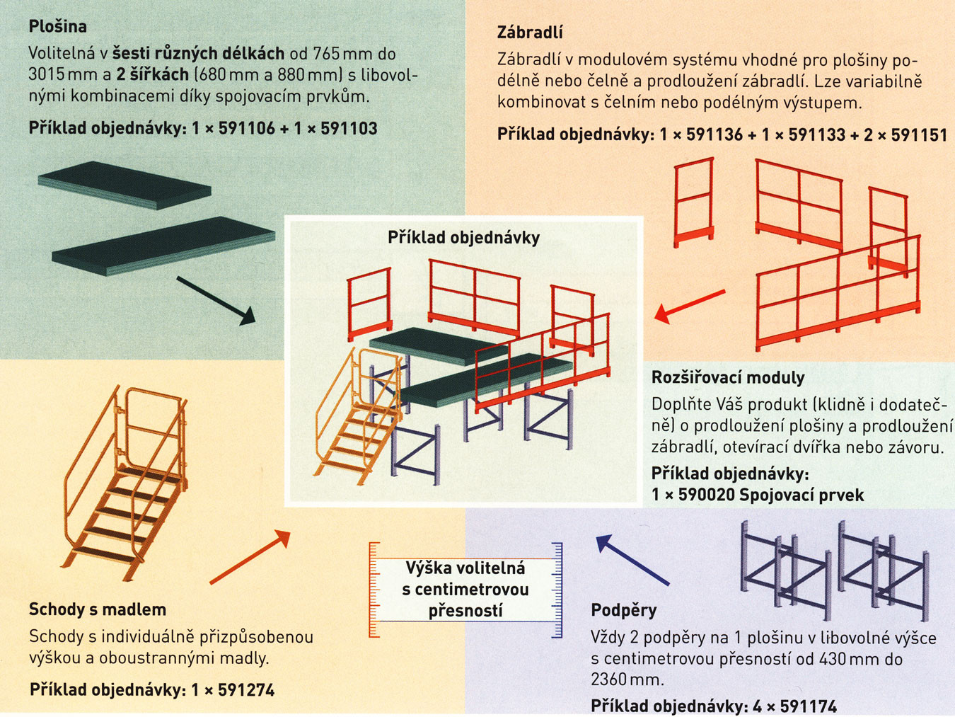 Jsou vždy volitelné výškově s přesností 10 mm od 430 do 2 360 mm, a to vždy 2 na jednotlivou plošinu.