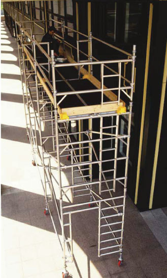 Toto velice používané pojízdné lešení má přednosti, jako je nízká hmotnost, tuhá konstrukce.