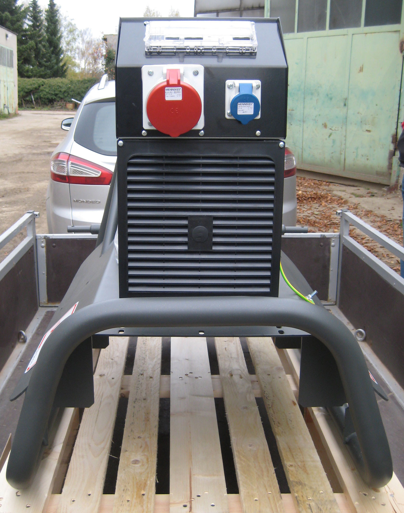 - zásuvka 230 V/16 A, zásuvka 400 V/63 A, proudový chránič 30 mA, jistič 4 polový, jistič 2 polový, voltmetr, ampérmetr, ukazatel frekvence, počítadlo motohodin