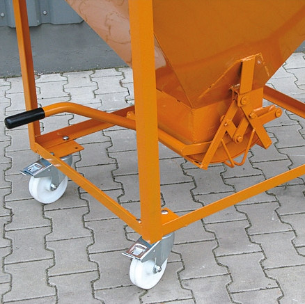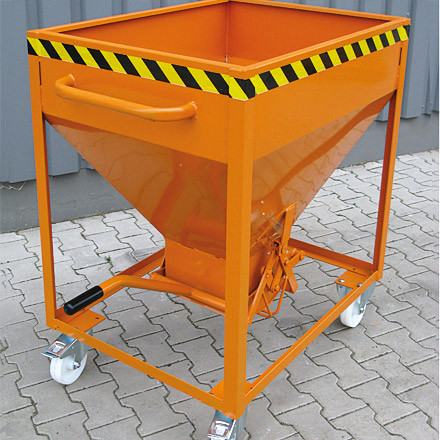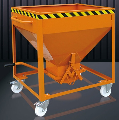 Silo-kontejner Eichinger. Tento kontejner je na 4 kolečkách a slouží pro navážení sypkých materiálů a jejich vpouštění do vpustí.