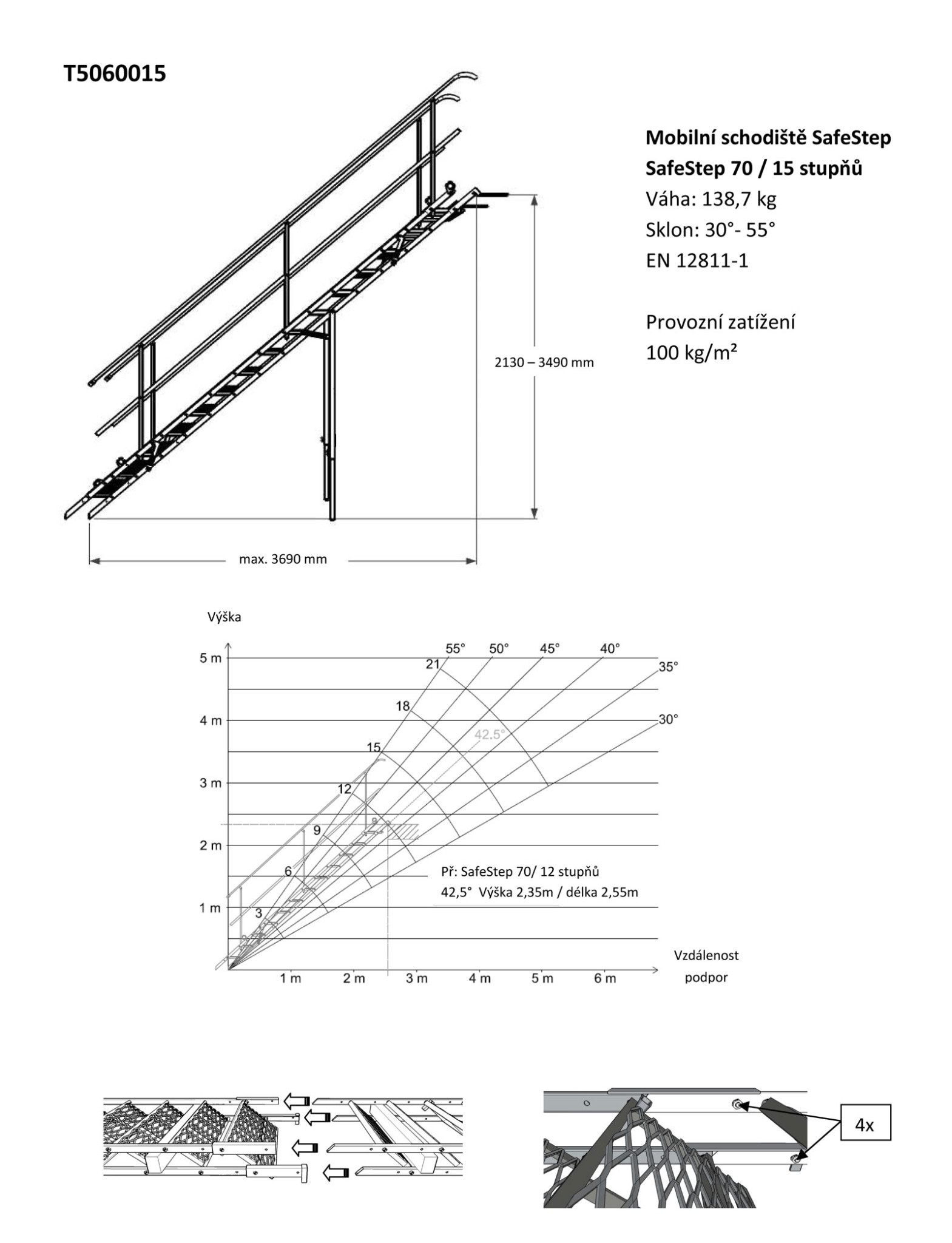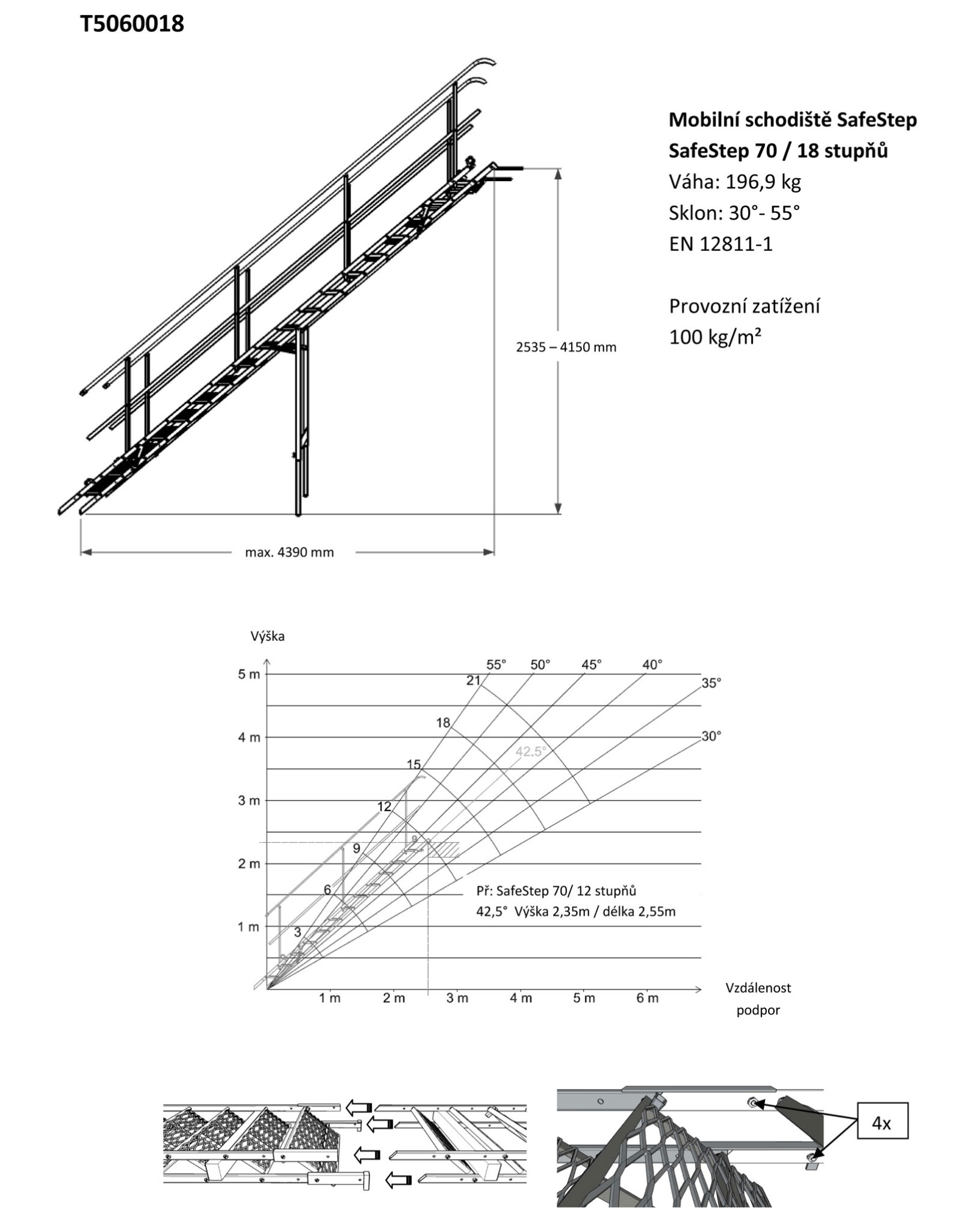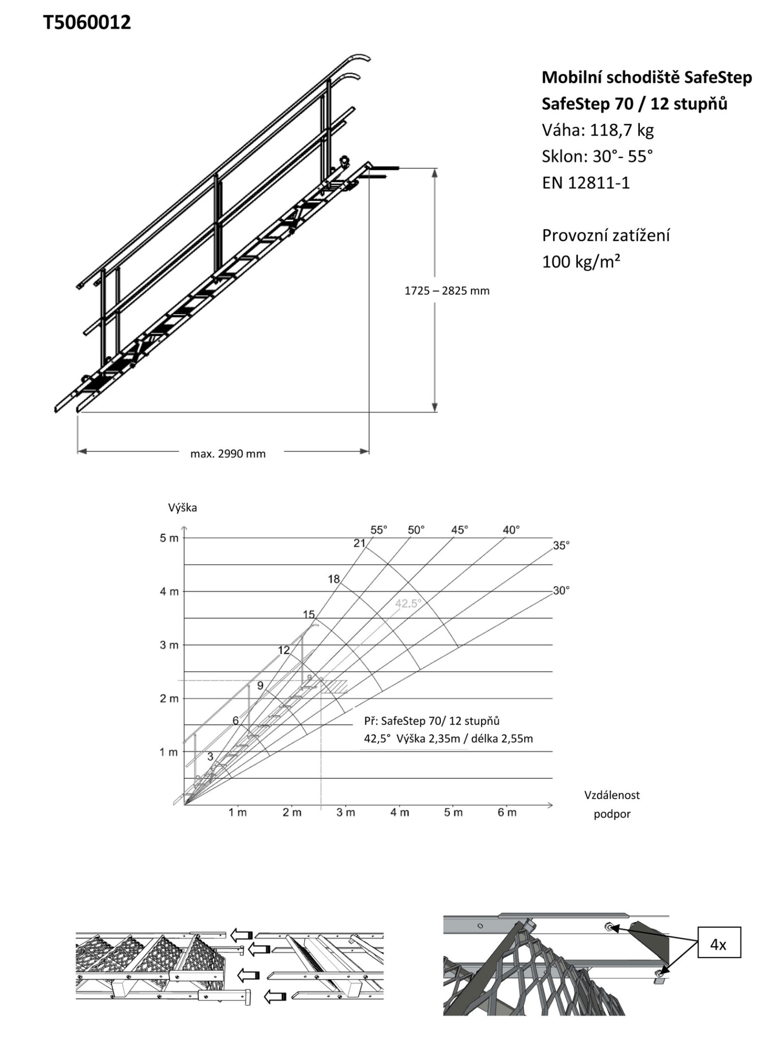Schodiště lze spojovat do maximální svislé výšky 4,75 m. Provozní zatížení je 100 kg/m2. Vlastní manipulaci lze provádět i jeřábem, schodiště mají 2 páry úchytů.