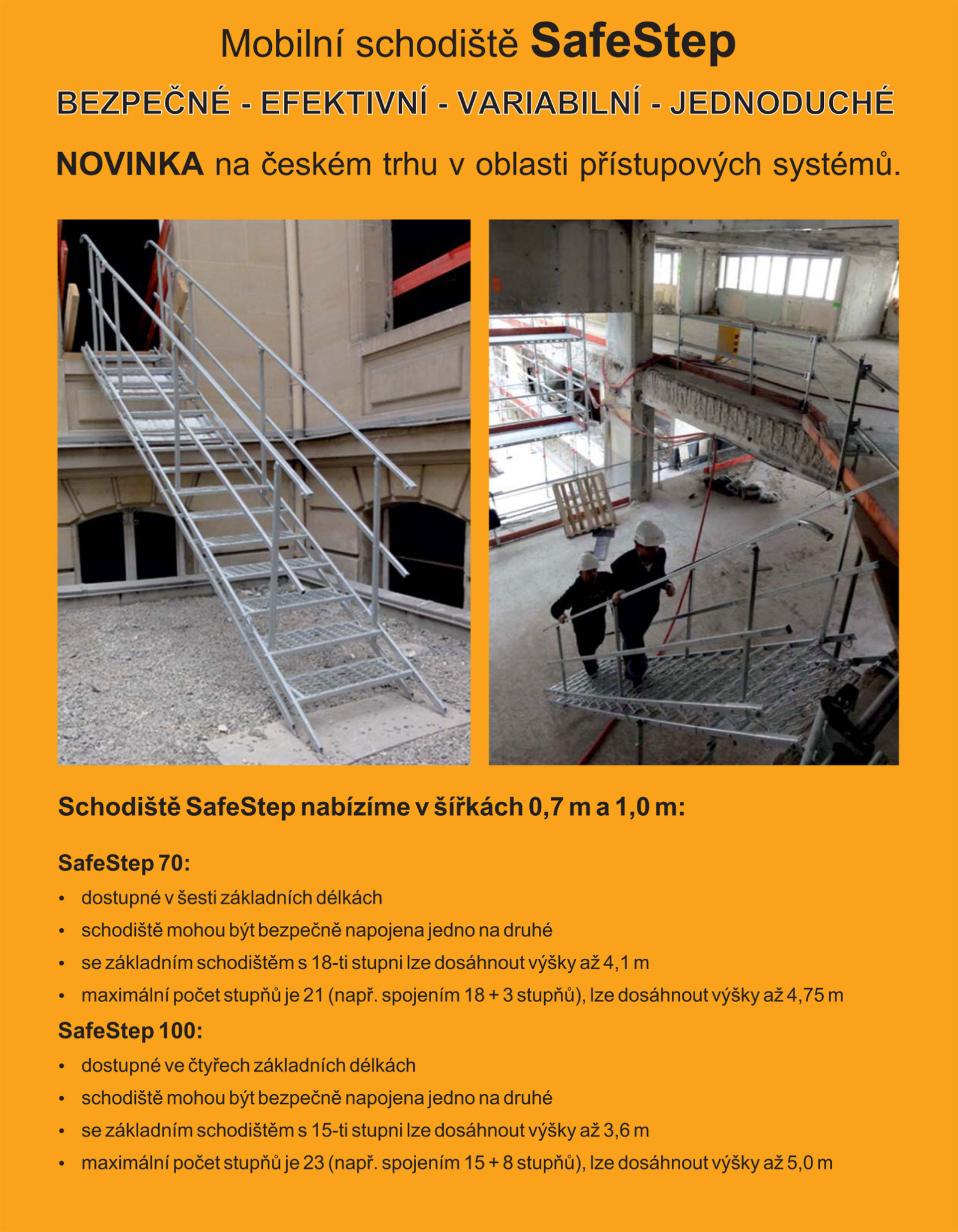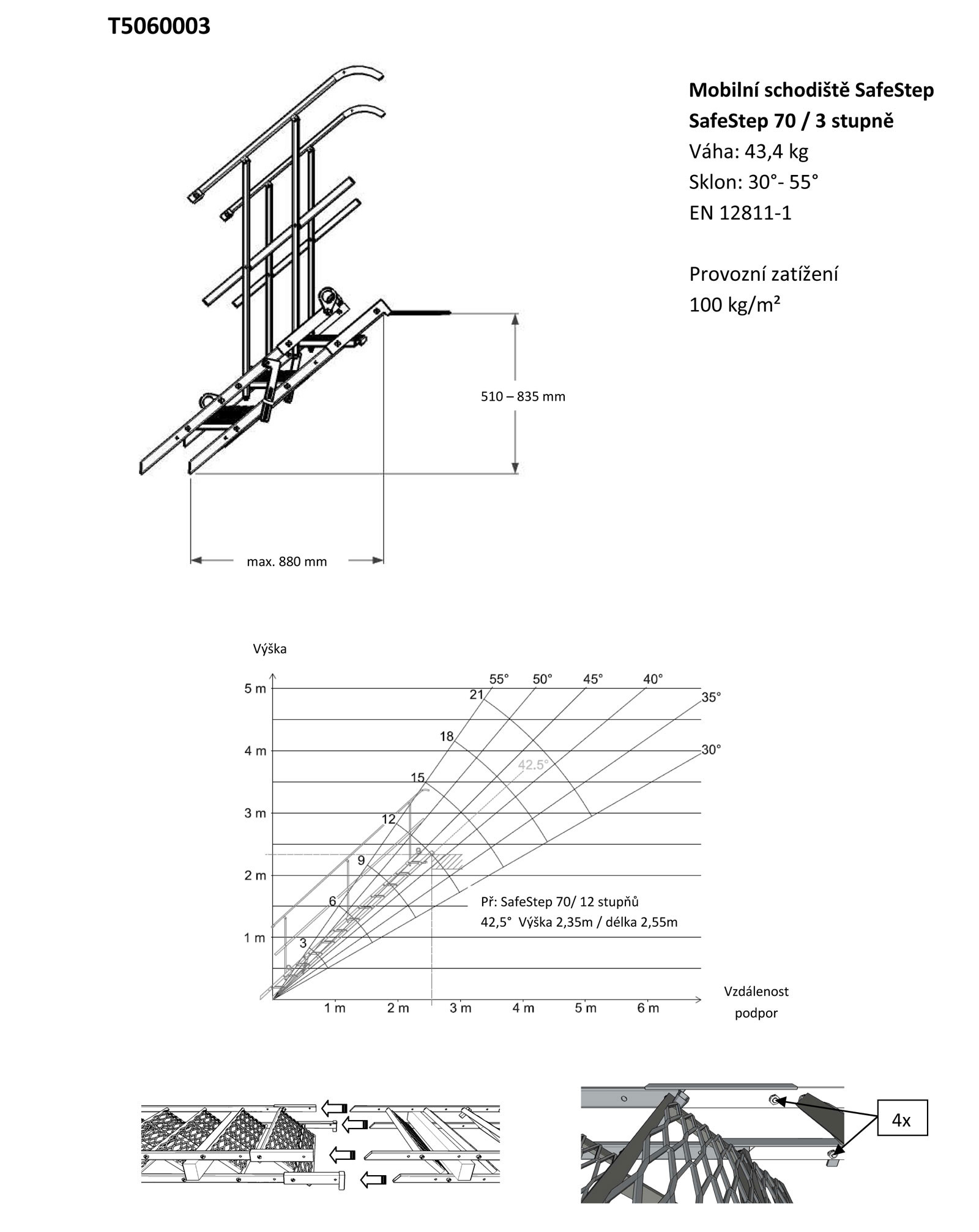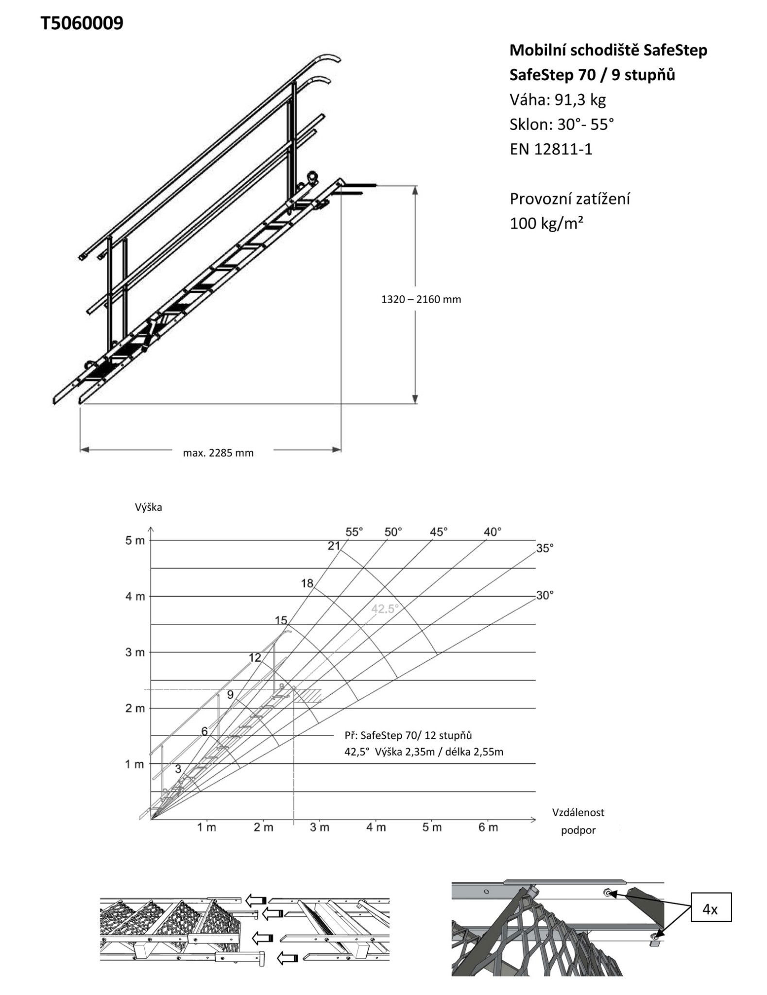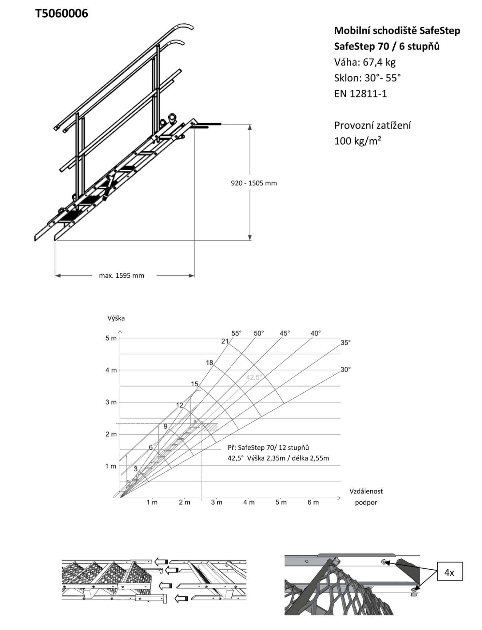 Schodiště lze spojovat do maximální svislé výšky 4,75 m. Provozní zatížení je 100 kg/m2. Vlastní manipulaci lze provádět i jeřábem, schodiště mají 2 páry úchytů.