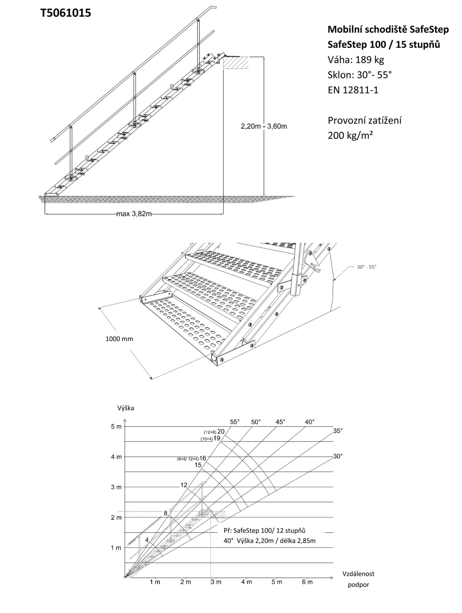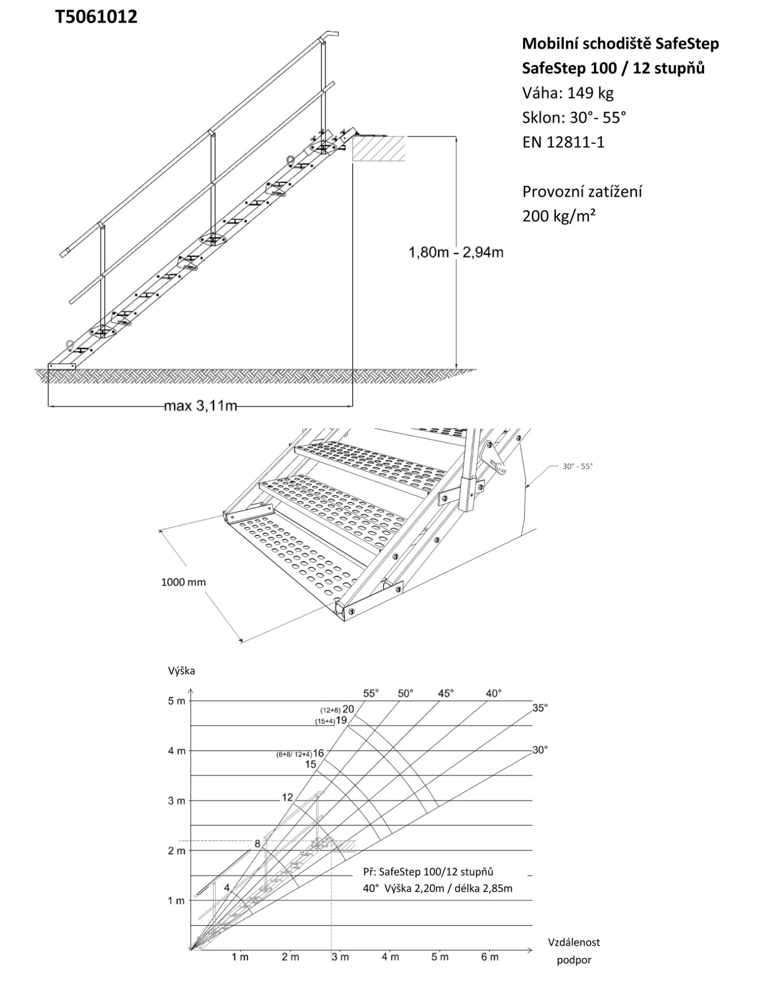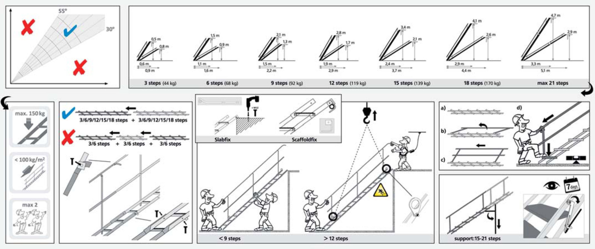 Schodiště lze spojovat do maximální svislé výšky 5,0 m. Provozní zatížení je 200 kg/m2. Vlastní manipulaci lze provádět i jeřábem, schodiště mají 2 páry úchytů.