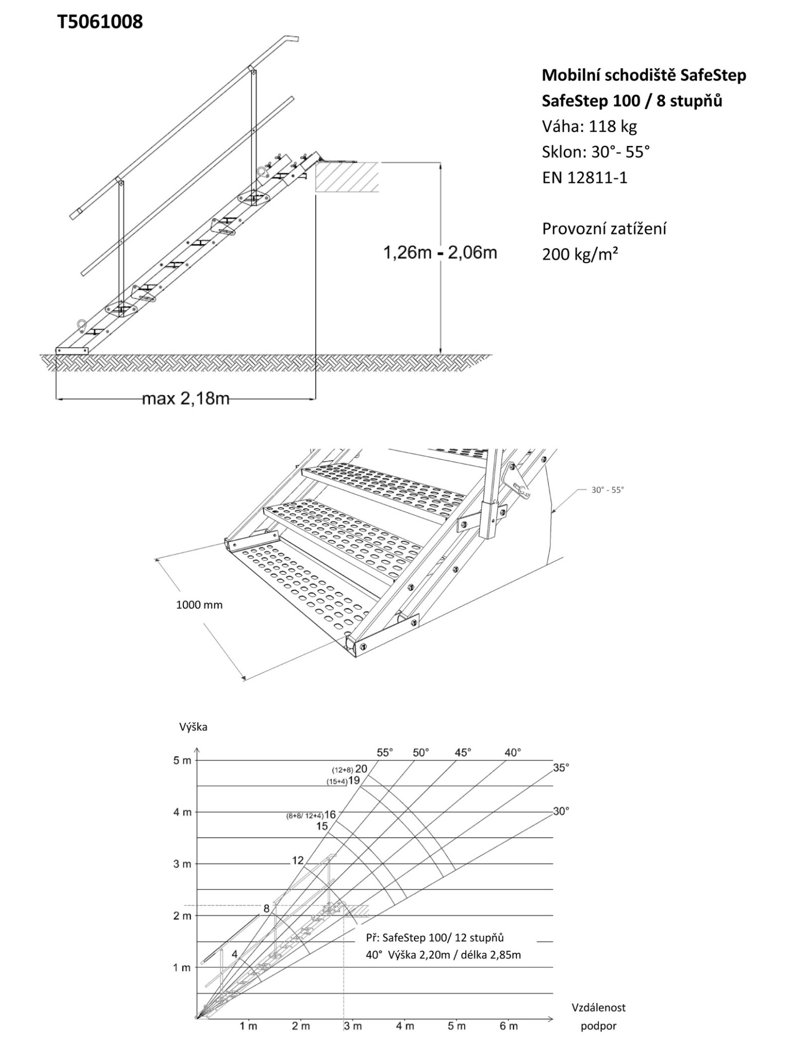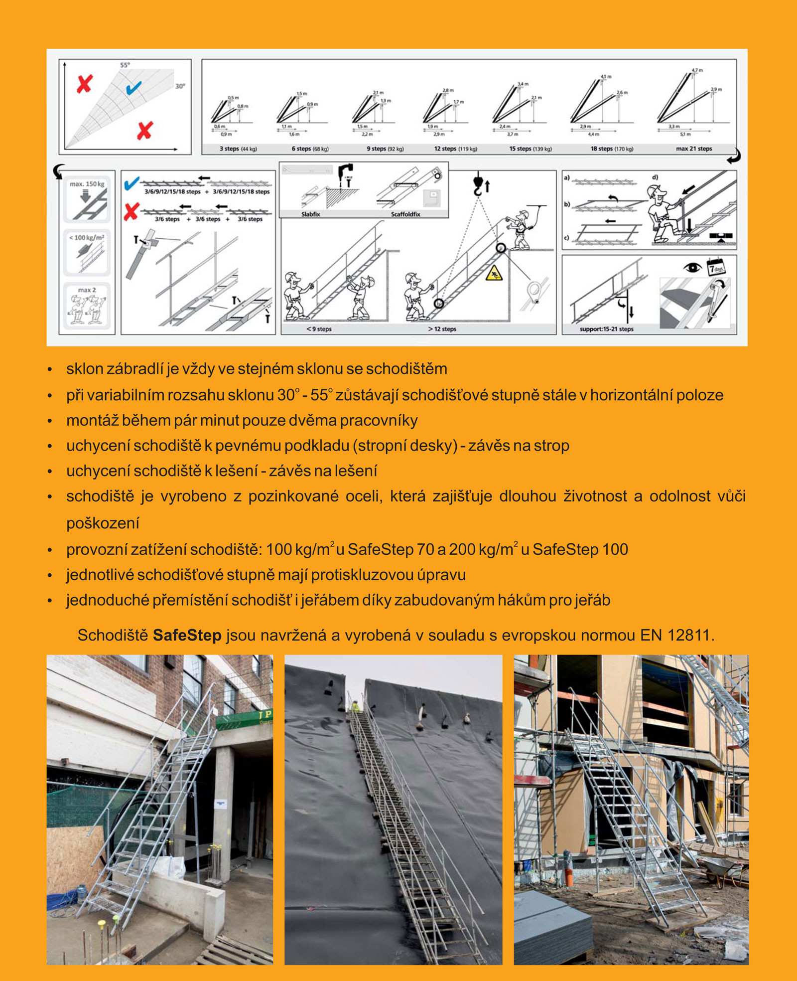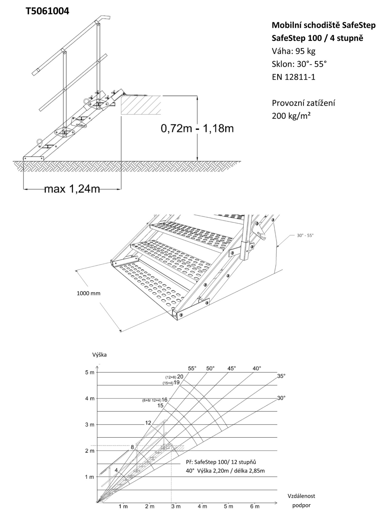 Schodiště lze spojovat do maximální svislé výšky 5,0 m. Provozní zatížení je 200 kg/m2. Vlastní manipulaci lze provádět i jeřábem, schodiště mají 2 páry úchytů.