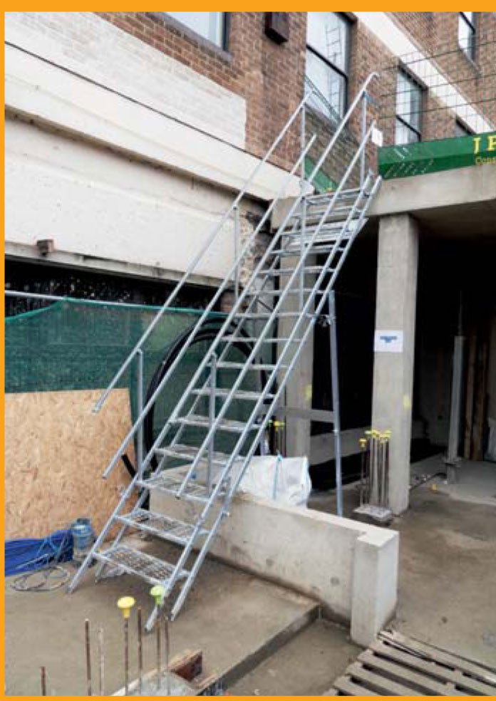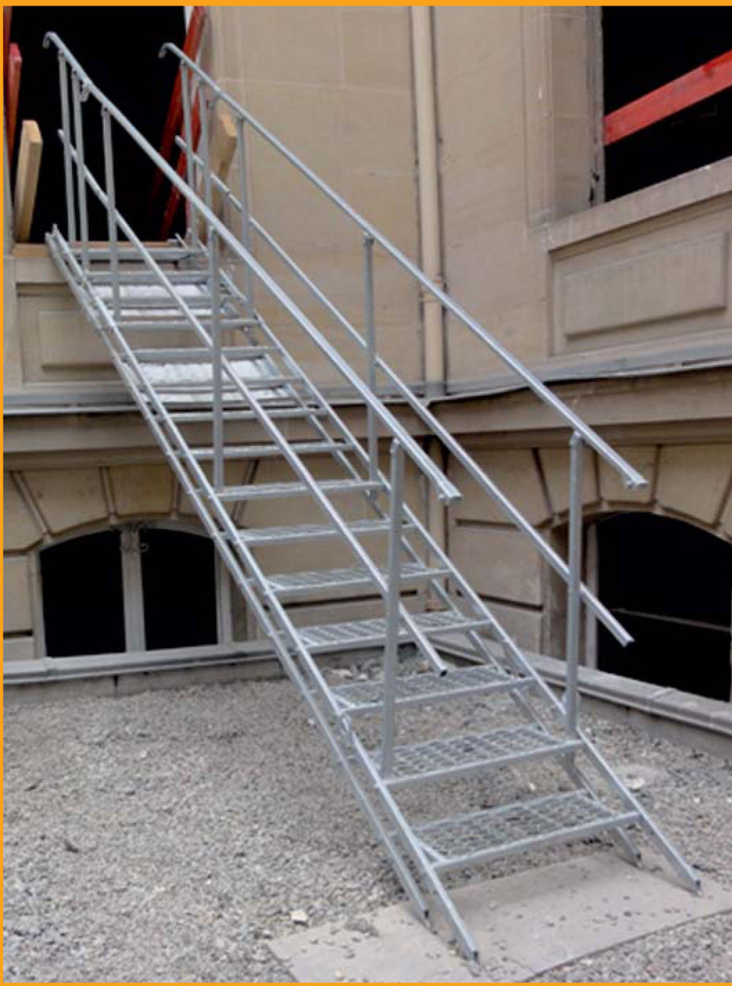 Uvedená schodiště fungují, jako kompletní sestava. V daném sklonu od 30° do 55° jsou schodišťové stupně stále ve vodorovné poloze. K vlastnímu schodišti po jeho zakotvení se nasadí a zabezpečí na obou stranách zábradlí, které je vždy rovnoběžné se schodištěm. Schodiště je vyrobeno z oceli, schodišťové stupně jsou roštové konstrukce. Celé schodiště, včetně zábradlí je žárově zinkováno.