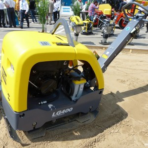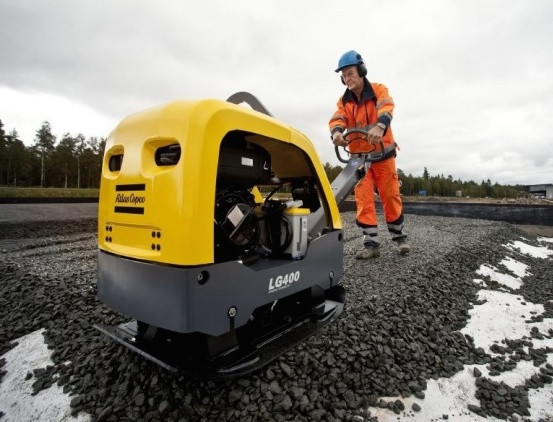 Obousměrná vibrační deska Atlas Copco. Je vybavena motorem Lombardini 15 LD 440/6,2 s ručním startem.