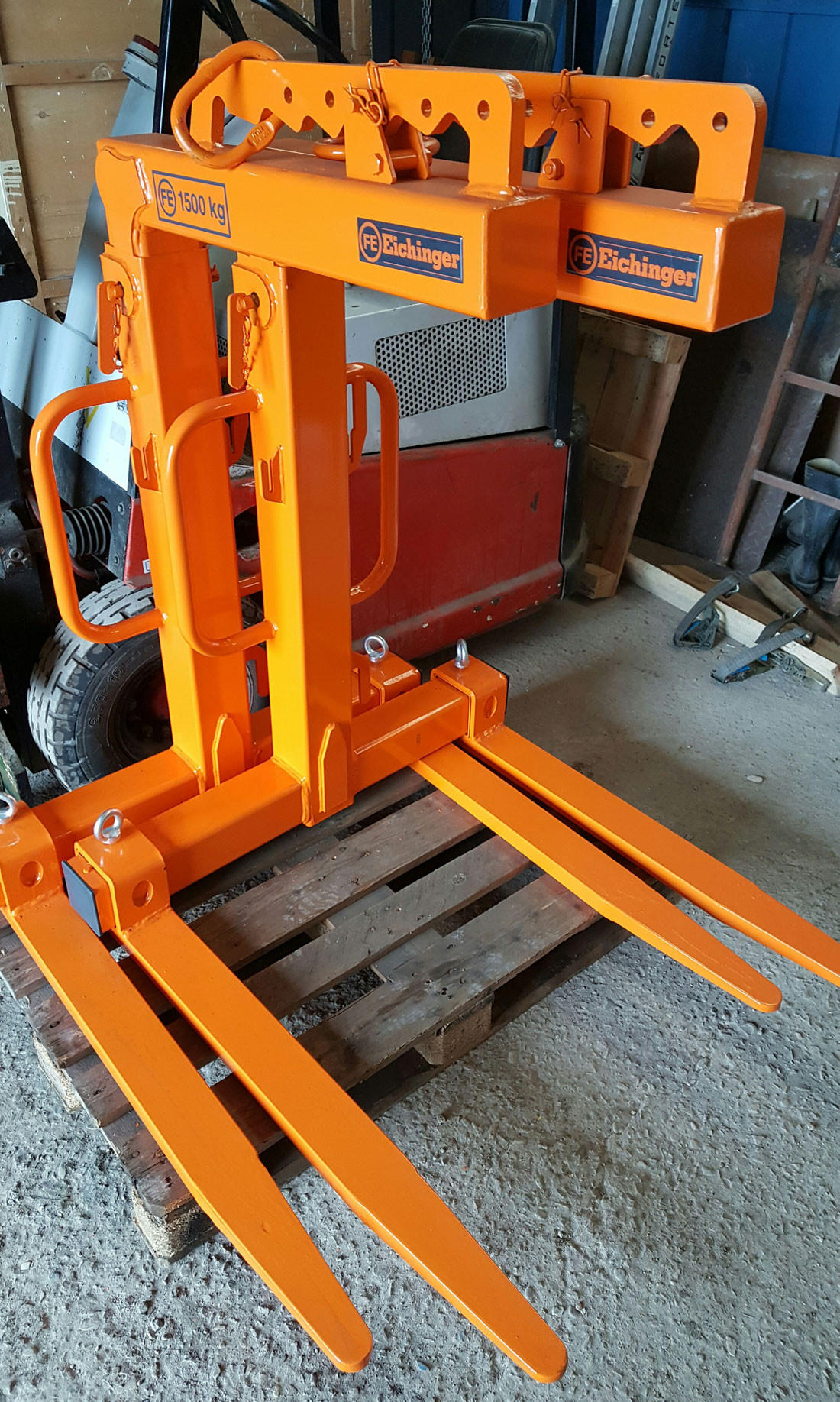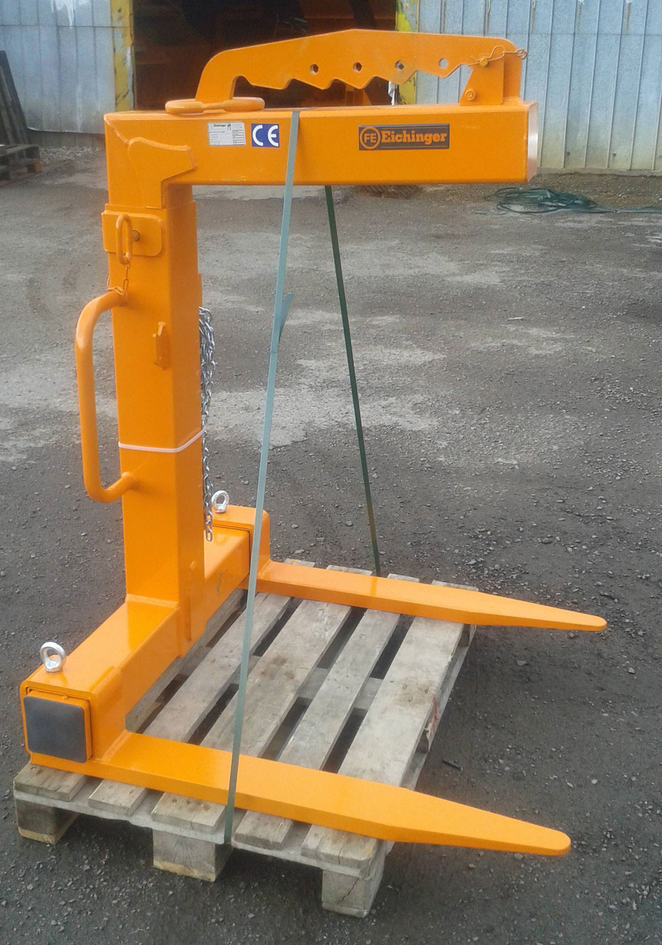 Závěsné vidle na palety Eichinger, typ 1053.4 jsou určeny na manipulaci s břemeny do hmotnosti 2000 kg a celkové výšky 115 - 180 cm. Středový sloup je teleskopický, zajištění příslušné výšky je pomocí svorníku.
