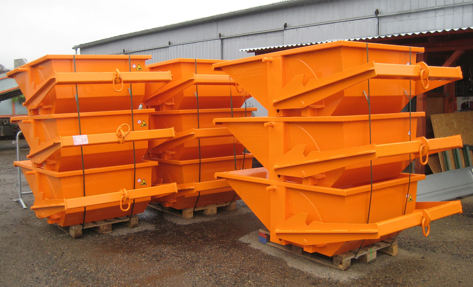 Výklopné kontejnery od německé firmy Eichinger jsou opatřeny závěsným ramenem, které při zvednutí je zaaretováno v pevné poloze, při položení kontejneru na zem a povolení lana je možno závěsné rameno vychýlit dozadu a při jeho opětovném zvednutí dochází k vyklápění kontejneru.