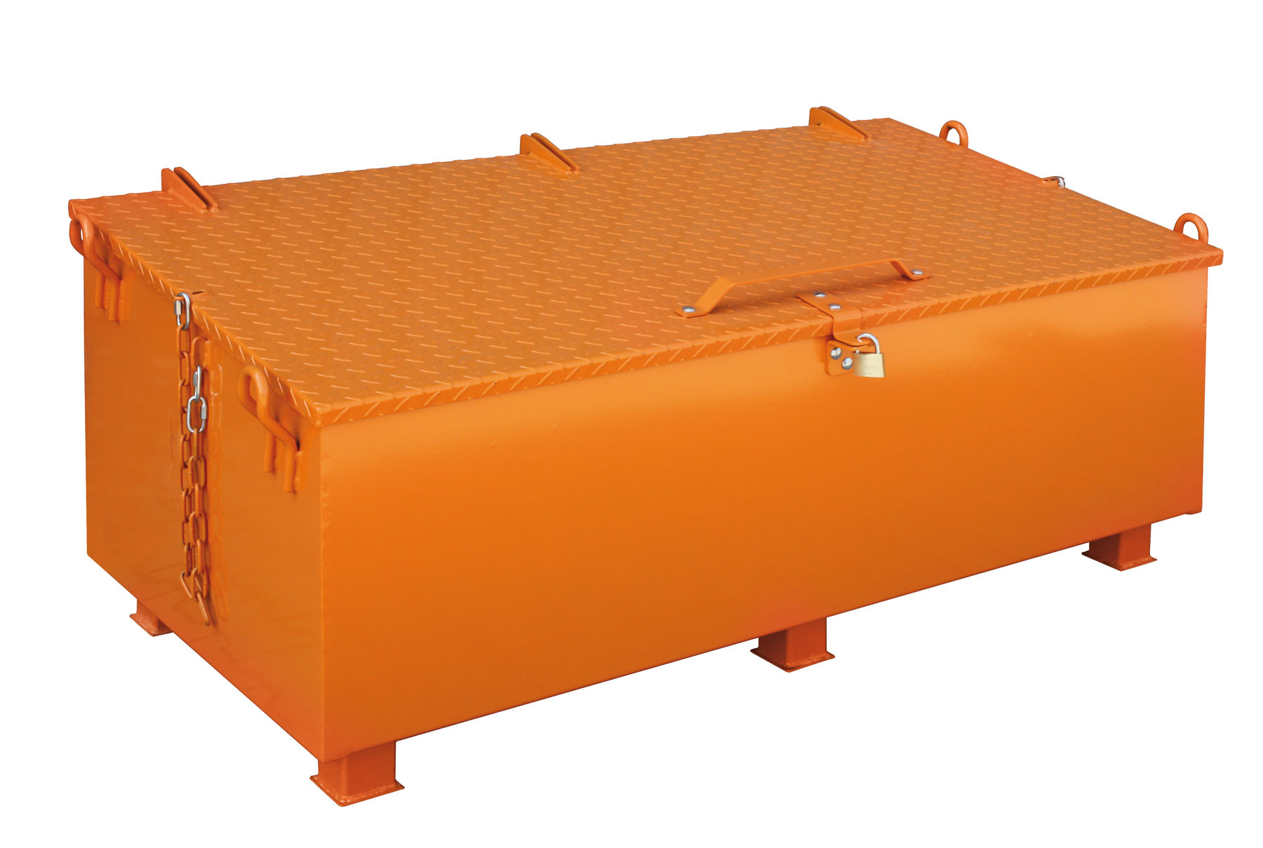 Ocelová prřepravní uzamykatelná bedna na nářadí s jeřábovými úchyty na přemisťování a ukládání stvebního nářadí a drobného materiálu. Celkem 3 velikosti v objemech 300, 500 a 600 litrů.
