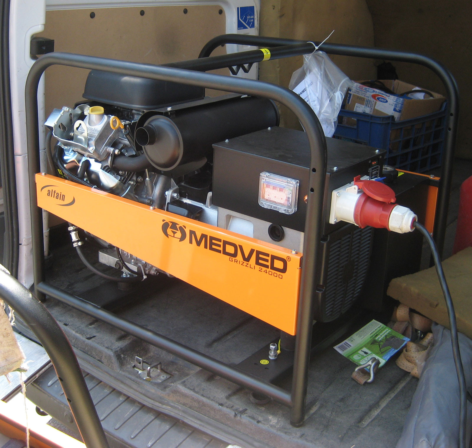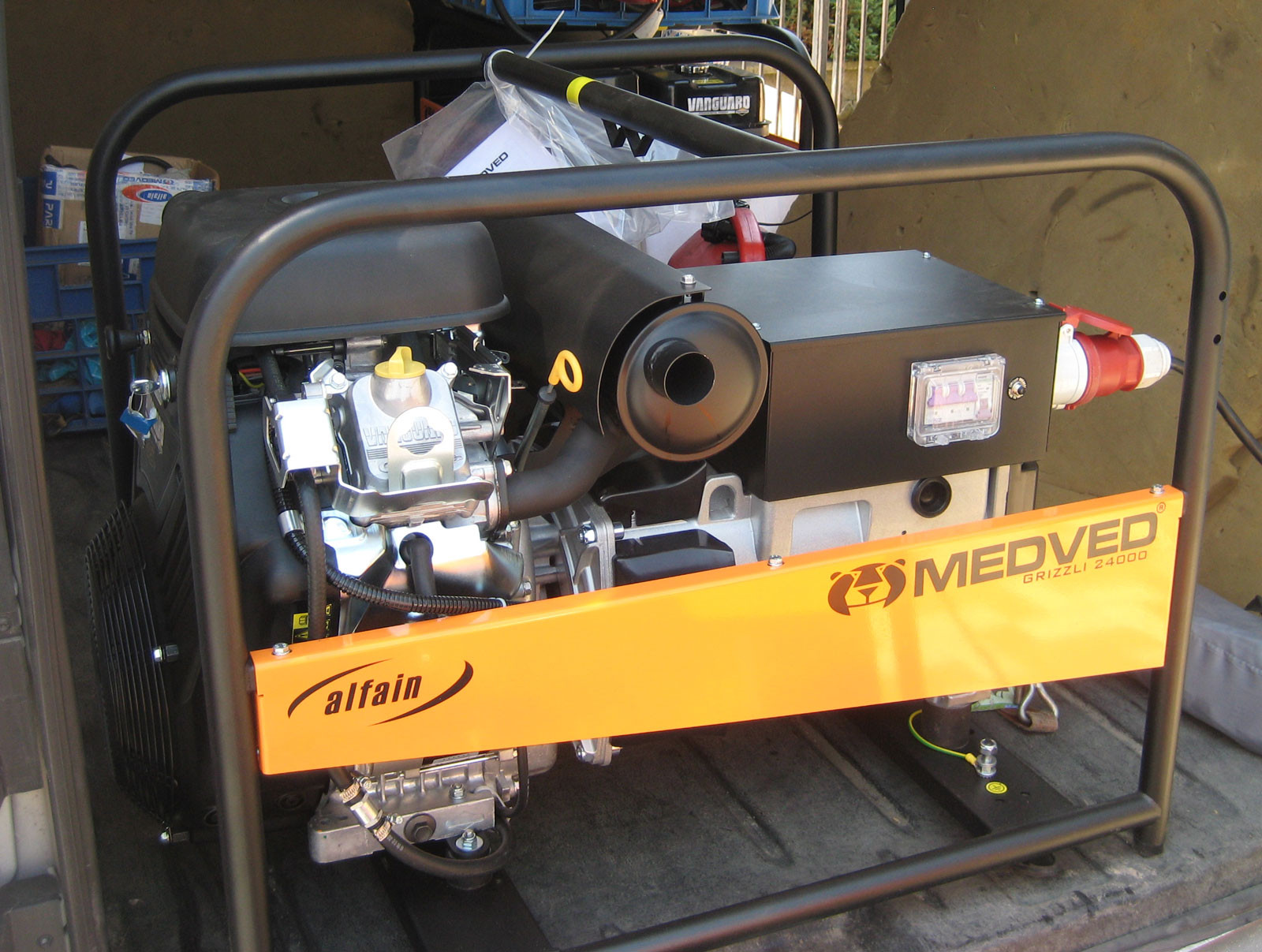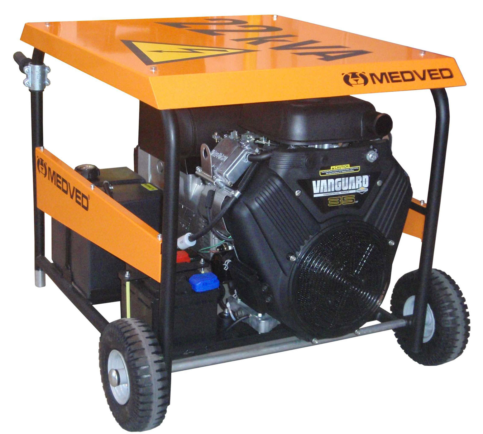 Profesionální třífazová elektrocentrála Medved GRIZZLI 24 000 VE - ATS pro náročný provoz. Elektrocentrála je vybavena podvozkem a kapacitní regulací. Celkový výkon centrály osazené motorem Vanguard V-Twin 6134 je 22 kVA na 3 fáze a 8,8 kVA na 1 fázi.