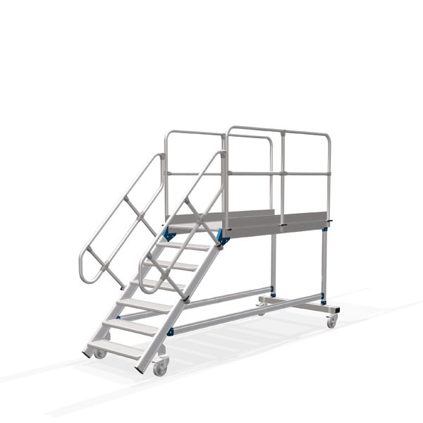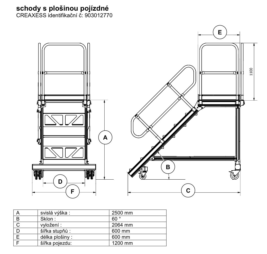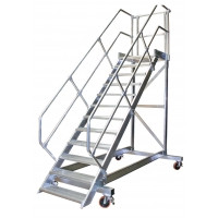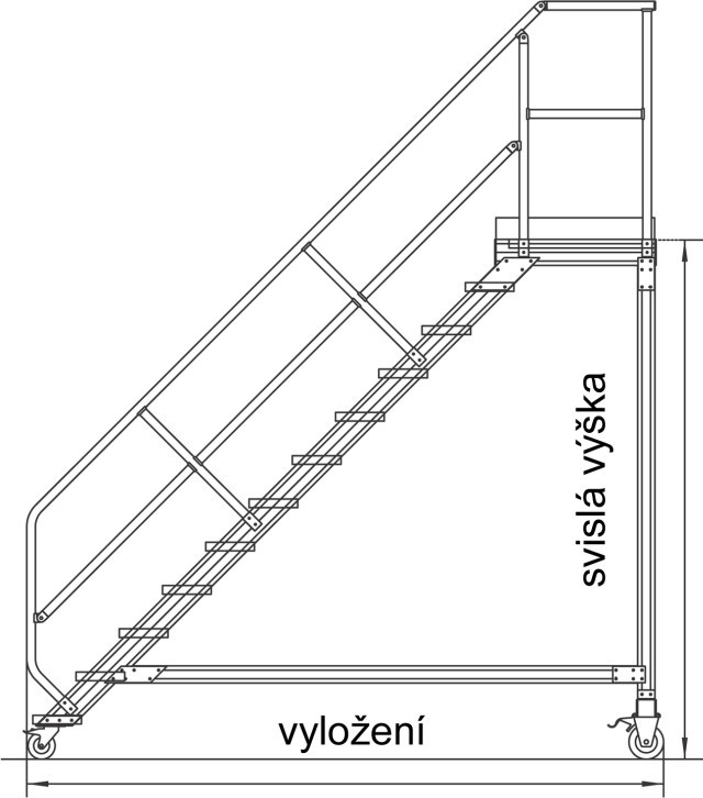Jedná se o pojízdné schodiště s podestou o délce 600 mm. Zábradlí je na obou stranách u schodiště a u podesty ze všech 3 stran. Všechna zábradlí jsou odnimatelná.