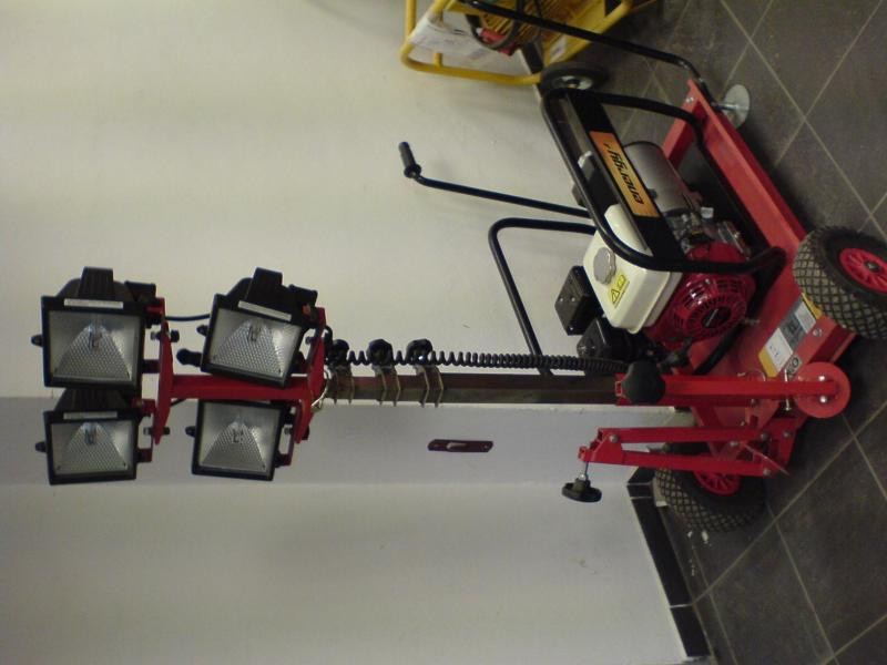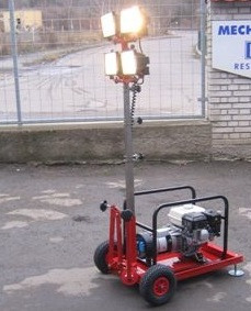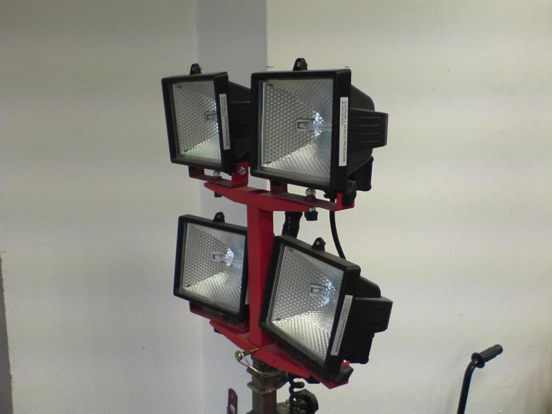 Teleskopický výsuvný stojan se 4 světly po 500 W. Součástí je podvozek, na který se umisťuje elektrocentrála, ta slouží jako zatěž.